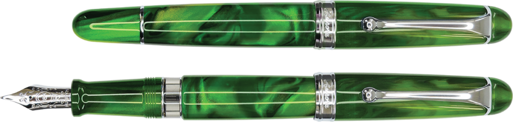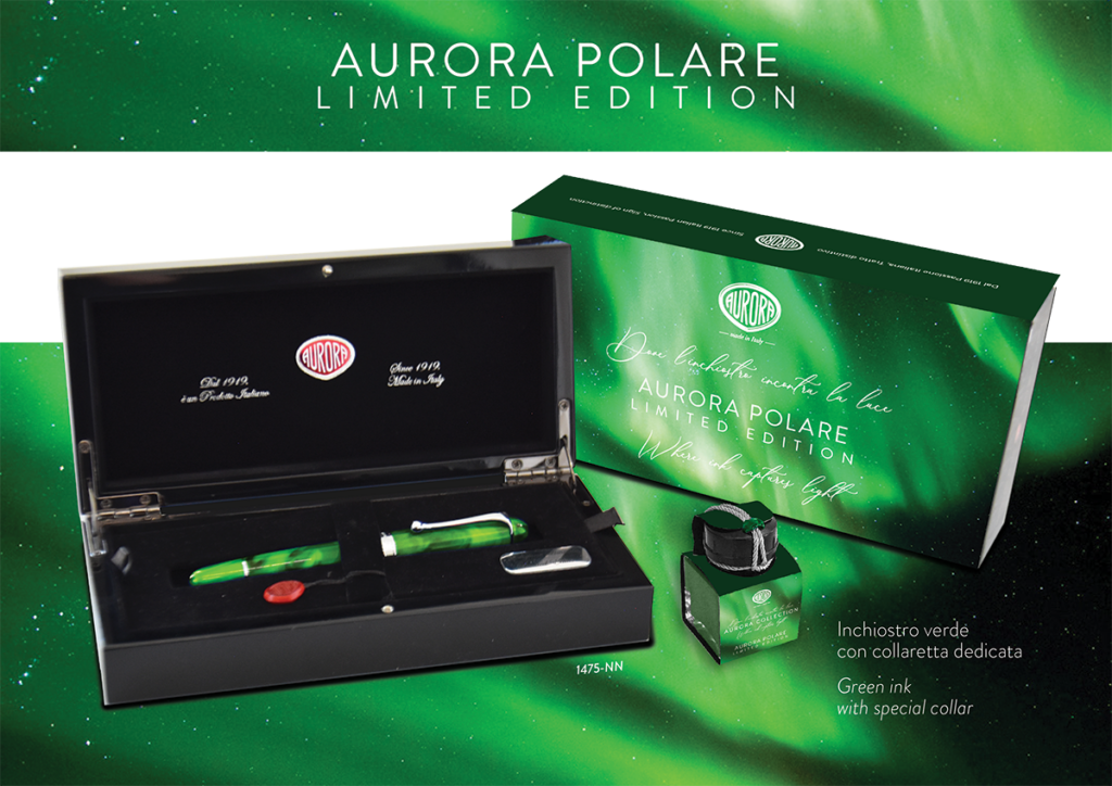 The Aurora Polare is a limited-edition fountain pen inspired by the ethereal beauty of the Northern Lights. Crafted from iridescent emerald-green Auroloide, its finish captures shifting shades and luminous reflections that vary with the light. Each pen features a unique pattern, echoing the dynamic movement of the polar sky.